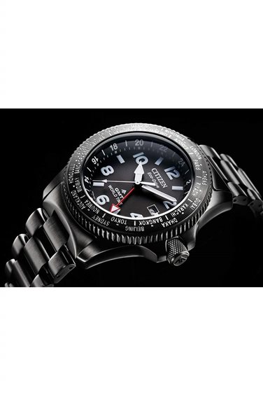 OROLOGIO CITIZEN PROMASTER GMT - referena BJ7107-83E. MOVIMENTO Eco Drive a carica luce con riserva di carica di 180 giorni. GMT con indicazione del ciclo orario delle 24 ore e di due fusi orari. Cassa e bracciale in acciaio PVD nero inossidabile. Ghiera con 24 città. Quadrante nero. Lancette e indici luminescenti. Datario ore 3. Corona a vite. Impermeabilità WR 20 BAR.