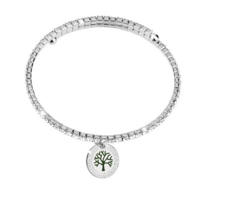 Il bracciale MyWorld a molla è in bronzo placcato con charm Albero della vita pendente e cristalli. È disponibile nelle finiture oro rosa o rodio bianco.