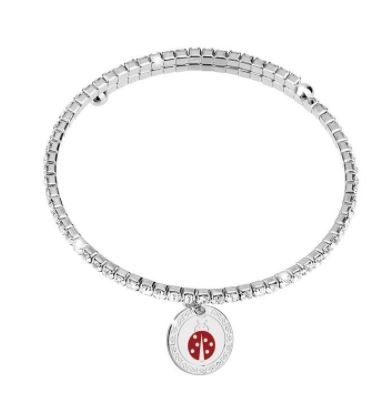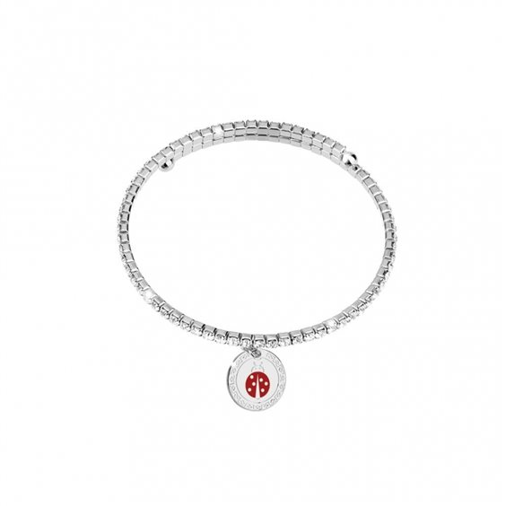 Il bracciale MyWorld a molla è in bronzo placcato con charm Fortuna pendente e Cristalli. È disponibile nelle finiture oro rosa o rodio bianco.