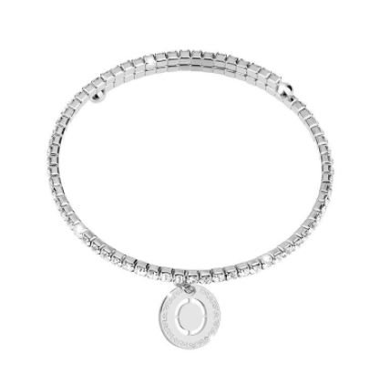 Il bracciale MyWorld a molla è in bronzo placcato con charm lettera pendente e cristalli. È disponibile nelle finiture oro rosa o rodio bianco.