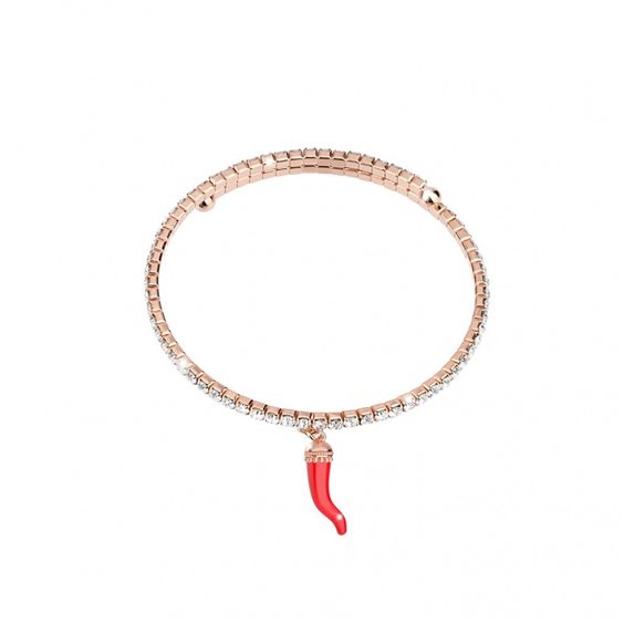 Bracciale MyWorld con cristalli colorati e charm a corno Il bracciale MyWorld a molla è in bronzo placcato con charm Portafortuna pendente e cristalli. È disponibile nelle finiture oro rosa o rodio bianco.